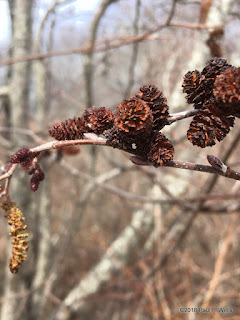 At the point where the trail re-emerges from the woods a pair of White-breasted Nuthatches was bopping around the trunk of a large old pine. After watching them for a bit we realized that they were going in and out of a small hole about 10-12 feet up the trunk. A telltale white smear around the bottom arc of the hole was a pretty clear indication that this was their nesting hole! A male Downy Woodpecker was also working the branches of the big pine, finding whatever it is that Downy Woodpeckers find to eat. A bit further on we were delighted to see a Brown Creeper circling his way up a medium-sized Red Maple tree, and making occasional forays to the smaller trees around it.